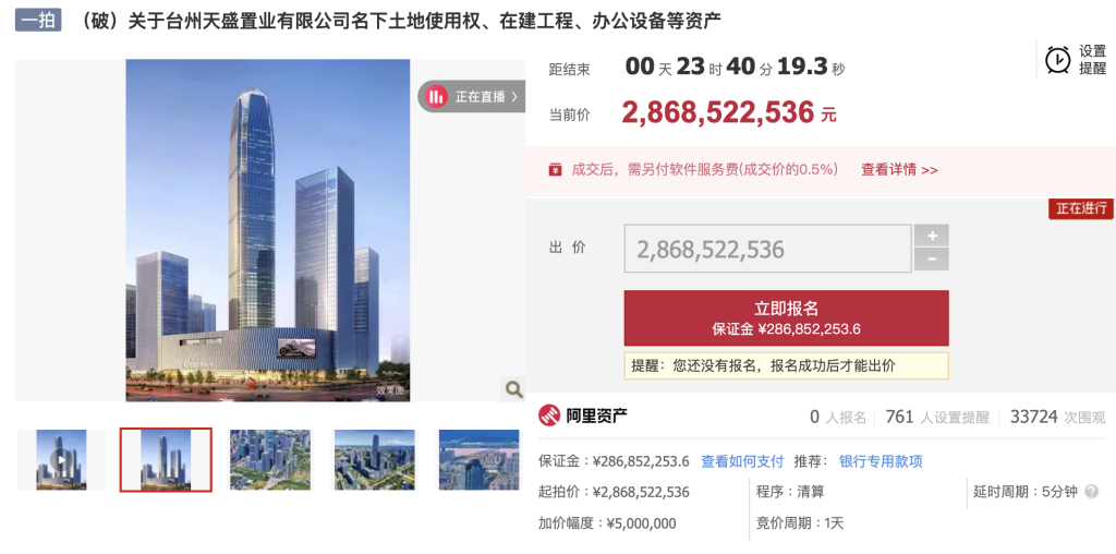 阿里资产平台显示,台州天盛置业有限公司管理人(简称“管理人”)将于2025年11月5日10时至2025年11月6日10时止(延时的除外)在淘宝网阿里拍卖破产强清平台上进行公开拍卖活动,本次拍卖的标的物为天盛公司名下“天盛中心”“购物公园”土地使用权、在建工程、办公设备、应收账款等资产,起拍价约28.685亿元。